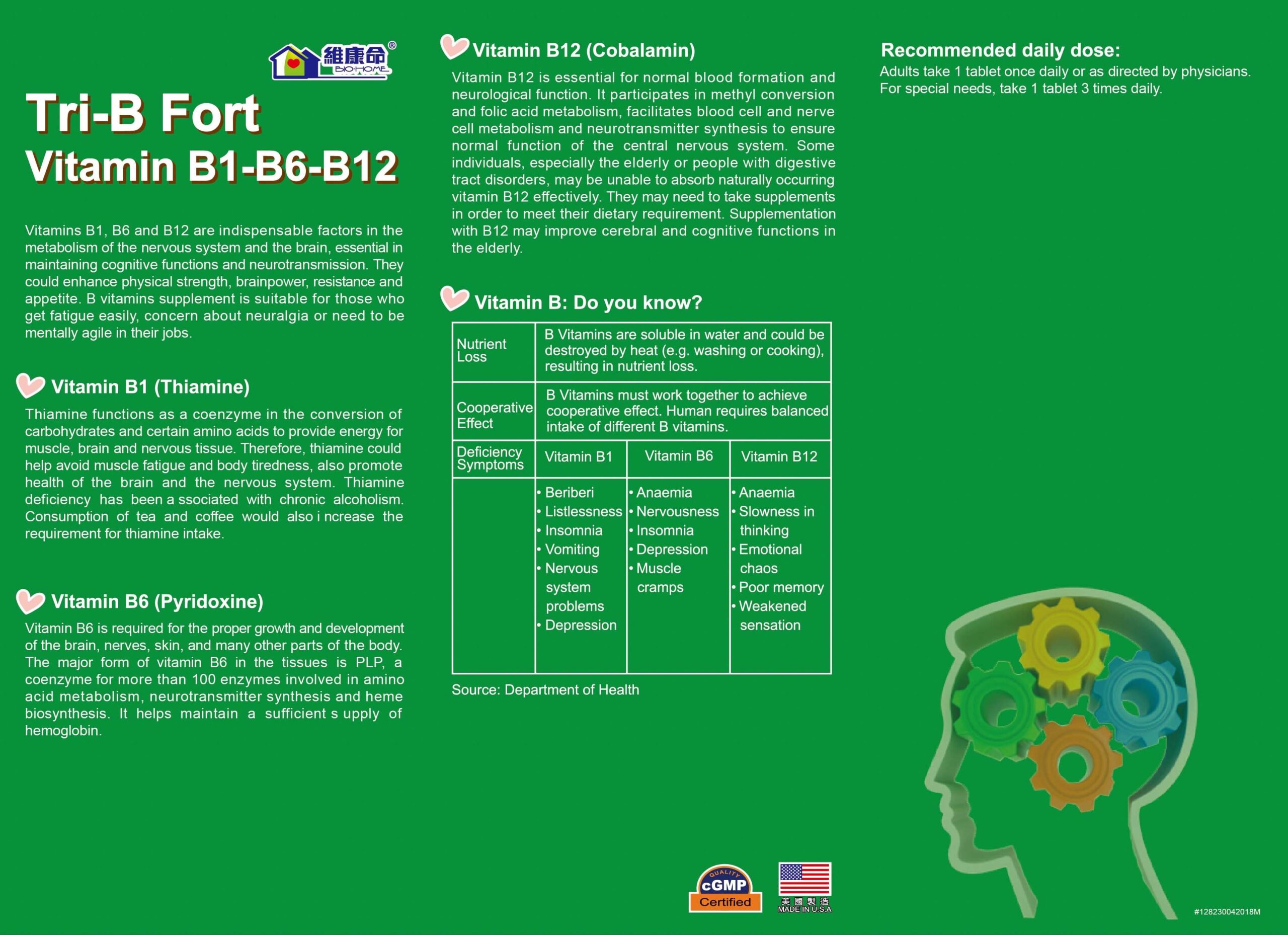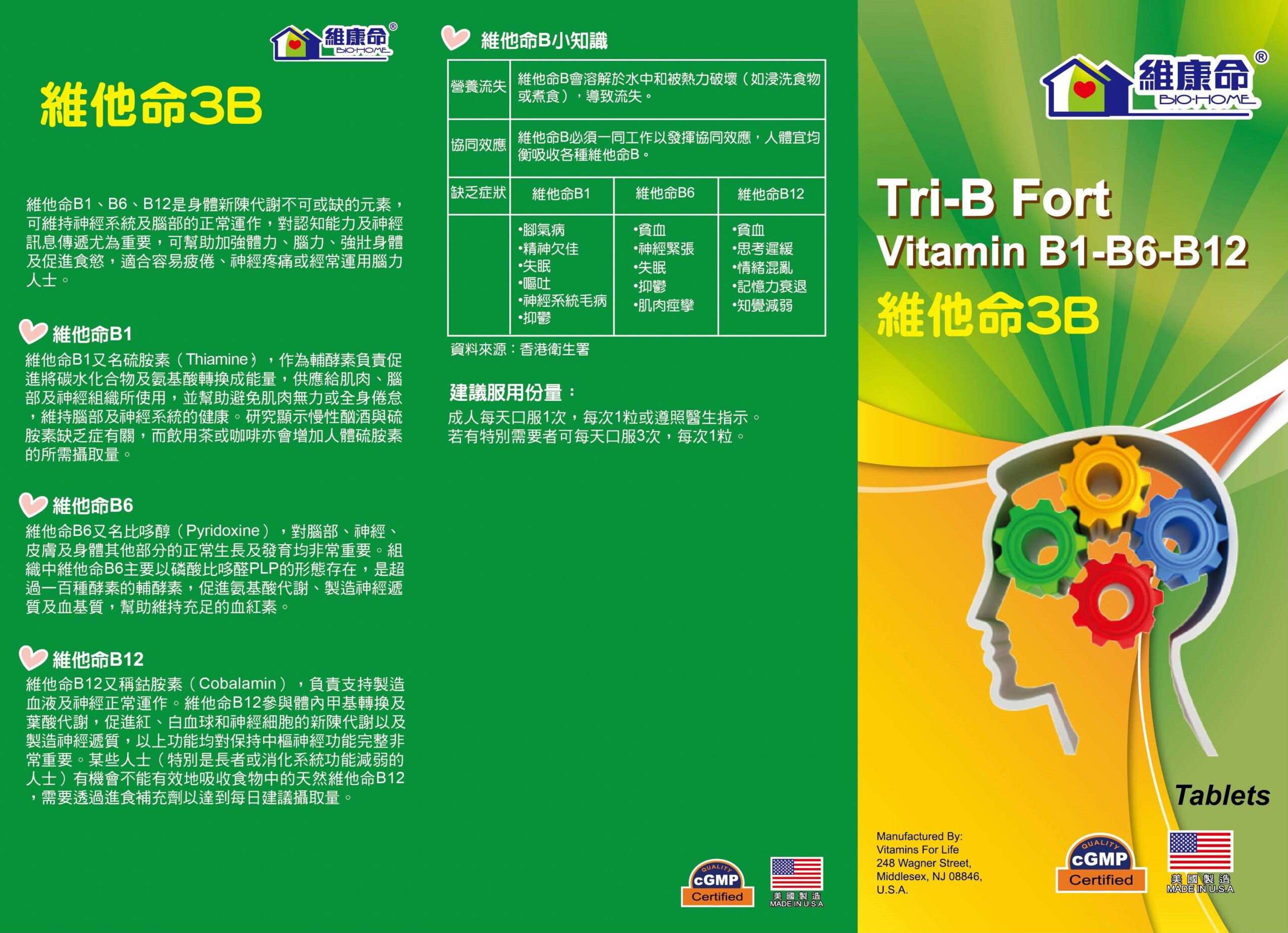 維他命B1、B6、B12是身體新陳代謝不可或缺的元素,可維持神經系統及腦部的正常運作,對認知能力及神經訊息傳遞尤為重要,可幫助加強體力、腦力、強壯身體及促進食慾,適合容易疲倦、神經疼痛或經常運用腦力人士。